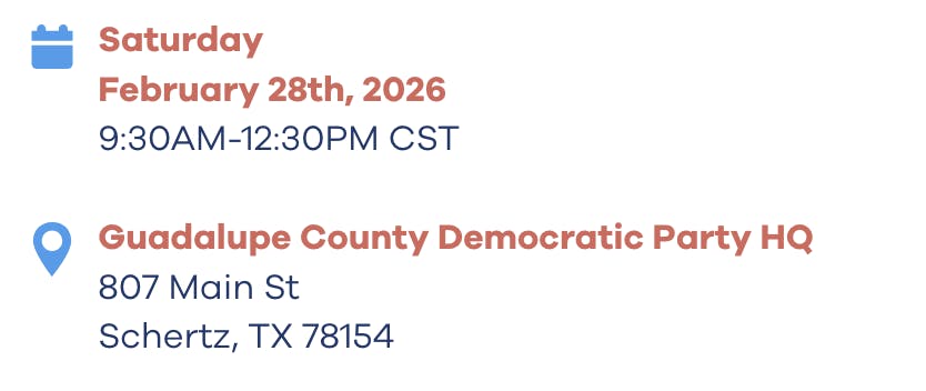 Drop in to the Guadalupe County Democratic Party Headquarters at any point from 9:30am-12:30pm this Saturday, February 28th for a training in how to knock doors for Steve. No RSVP needed, just come with a good pair of walking shoes, and pick up some snacks and water to fuel your canvass!